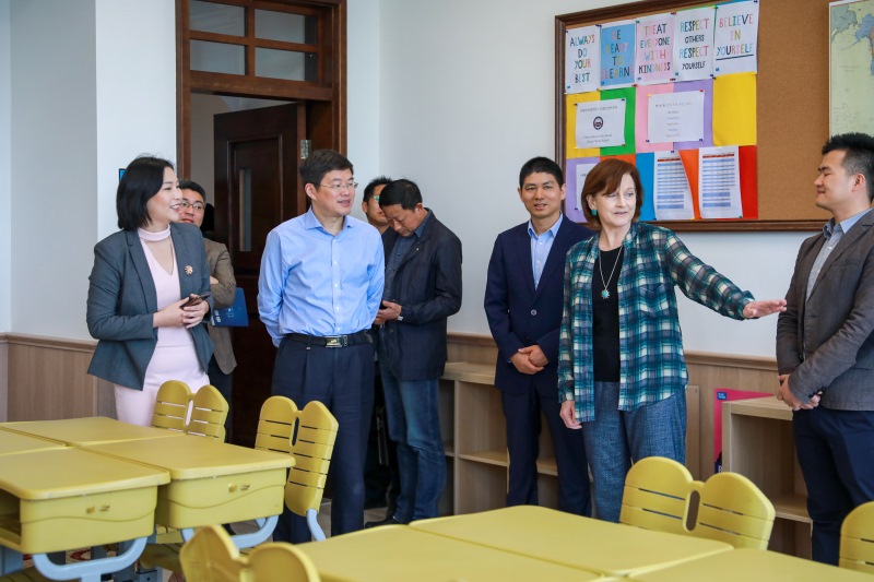 市領(lǐng)導(dǎo)一行參觀了幼兒園、小學(xué)、初中及美國(guó)高中的樣板教室,對(duì)校園環(huán)境贊不絕口,肯定了學(xué)校的國(guó)際化定位。謝軍副秘書(shū)長(zhǎng)仔細(xì)詢問(wèn)了校區(qū)建設(shè)情況、以及各教室的教具、家具配置標(biāo)準(zhǔn),以及材料安全等情況,并給予了高度評(píng)價(jià)。