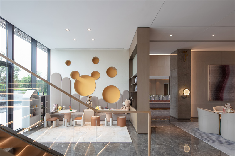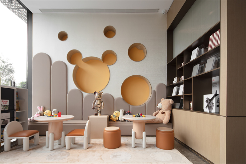 低飽和度的色彩搭配,點綴以明亮的黃色與橙色,整體空間充滿活力與童趣。這個靜處一隅的兒童閱讀區(qū),緊鄰洽談區(qū)與樣板間,讓生活的美好在這一刻就被感知。