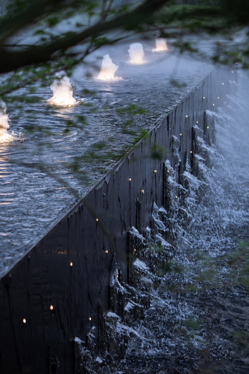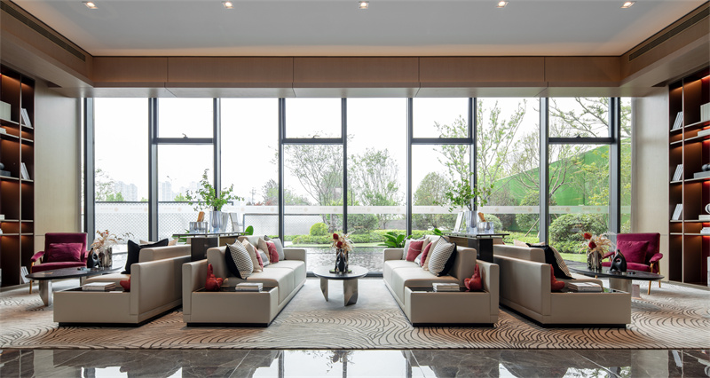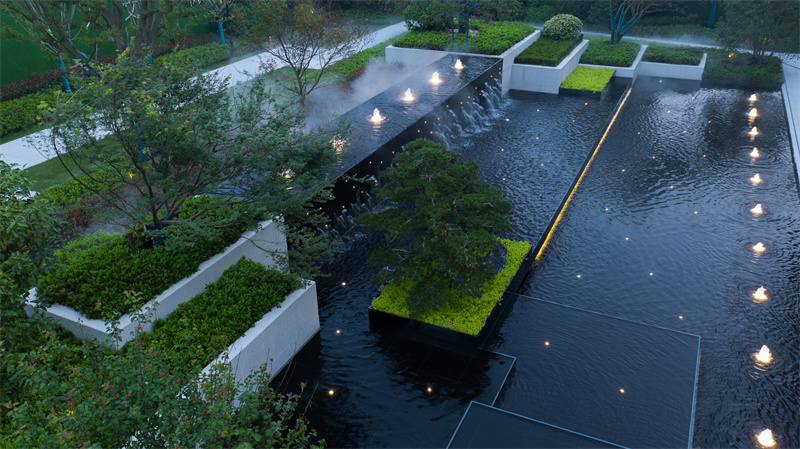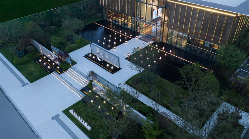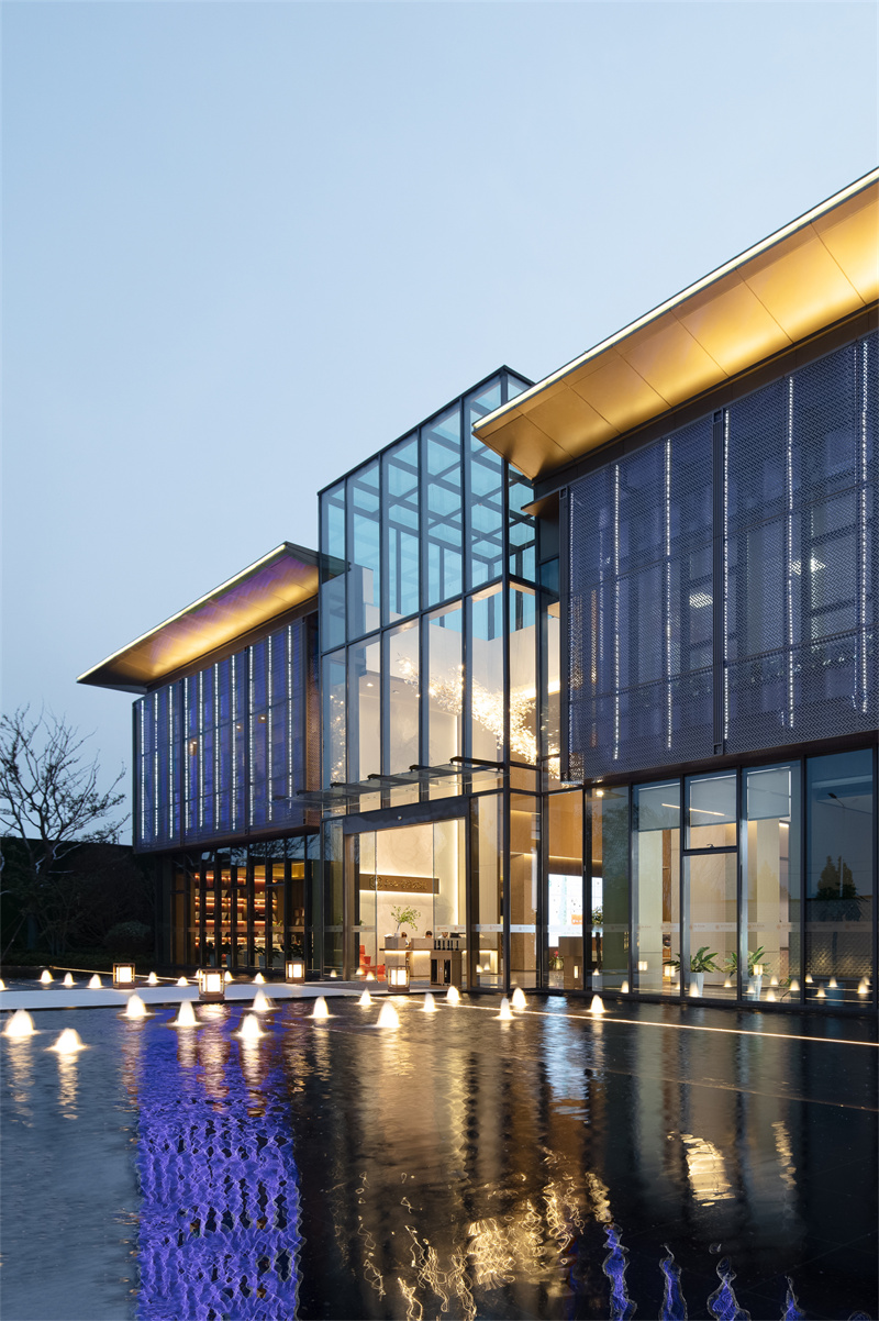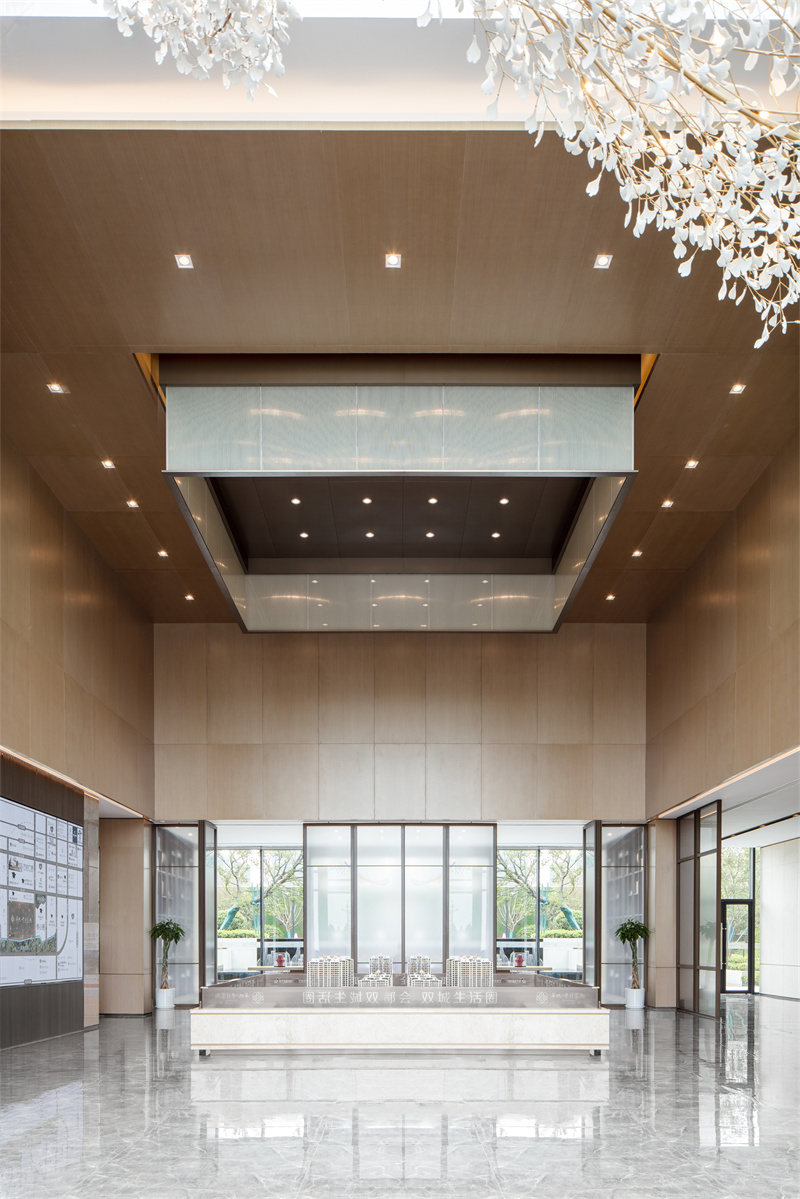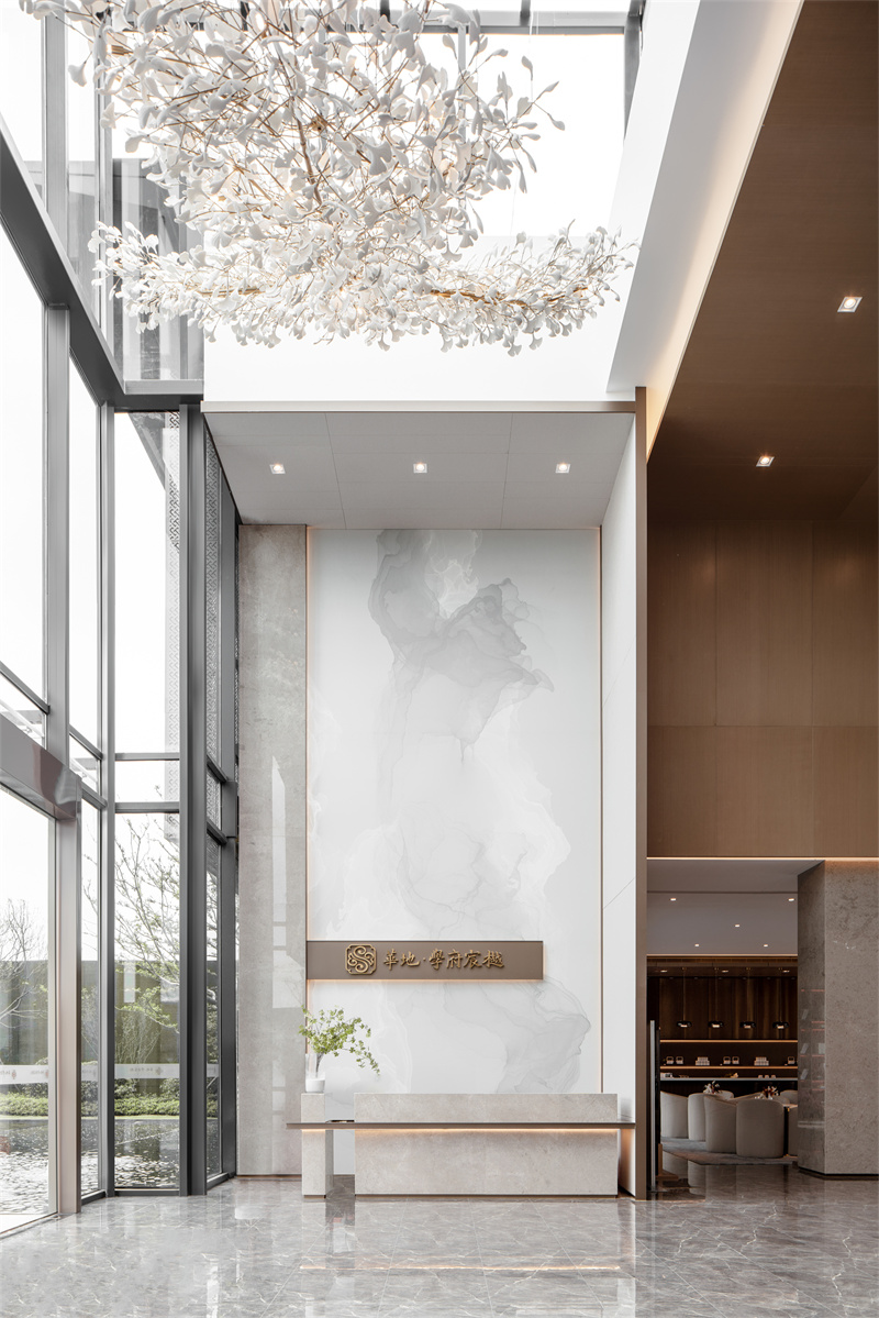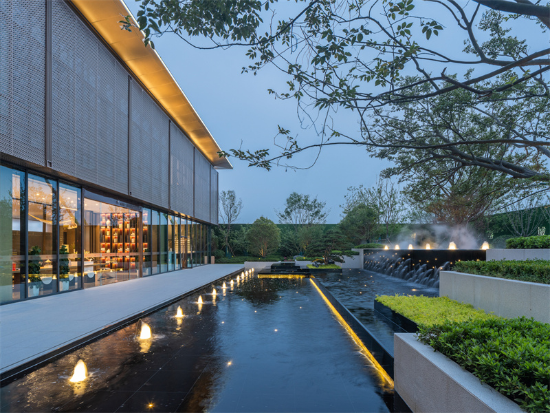 為致敬當?shù)匚幕厣?,以水做為環(huán)境的靈魂,一進迎賓,二進觀湖,三進尋瀑,將水揮灑到極致,在整個空間場景中呈現(xiàn)一場靈動的詩意美學。流水潺潺淙淙,仿佛輕奏歌謠,迎接每一位來賓的到訪,人與生活的嶄新通道,也借由這片水景,緩緩打開。