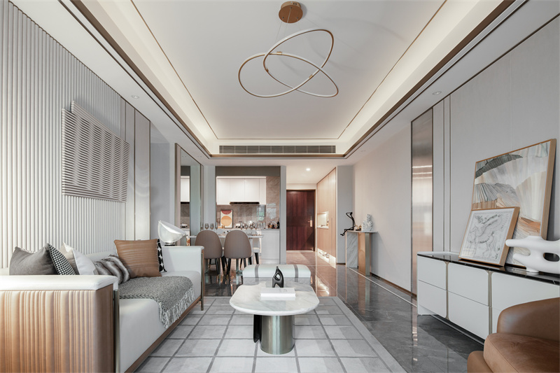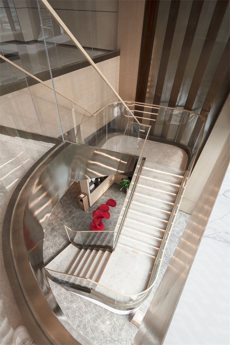 不遠處的藝術樓梯,讓另一側的景觀不再單調。玻璃、金屬扶手,高級冷艷,白色大理石踏步、金屬包邊,陽光與燈光交相輝映,在樓梯上描摹出水的波紋,讓通往二層的樣板區(qū)空間更具儀式感。
