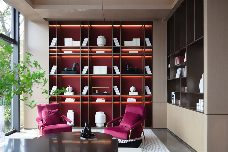 在帶有更強私密性的深度洽談區(qū),設計師通過兩側柜體構筑起一片自成畫意的空間。大面的景觀視野、金屬線條的置物架,整個空間通透明朗,紅色的背景、座椅點綴其間,氤氳出空間的靈動、時尚的氣質。