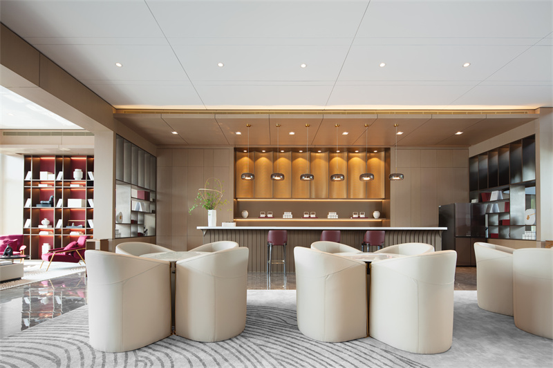 藝術和自然總能在某個節(jié)點美妙結合。陽光透過玻璃帷幕躍進室內,將花型裝置渲染得明亮生動。溫潤內斂的淺色系大理石,在燈光的映襯下,與銅色金屬碰撞出輕奢質感。洽談區(qū)延續(xù)了雅致、輕奢的質感,用金屬、木質、大理石、玻璃、皮、布藝等材質打造空間的豐富體驗,利用材質的軟與硬、剛與柔對比出空間的層次感。