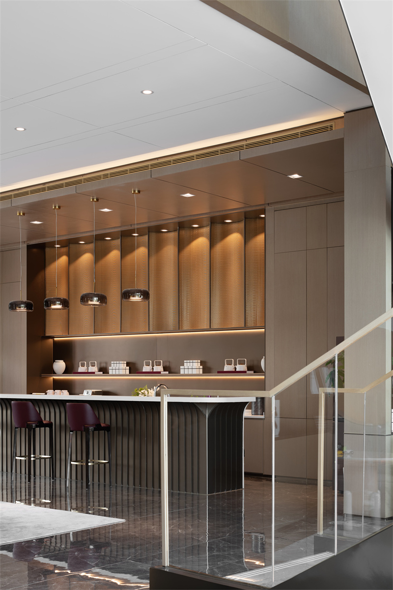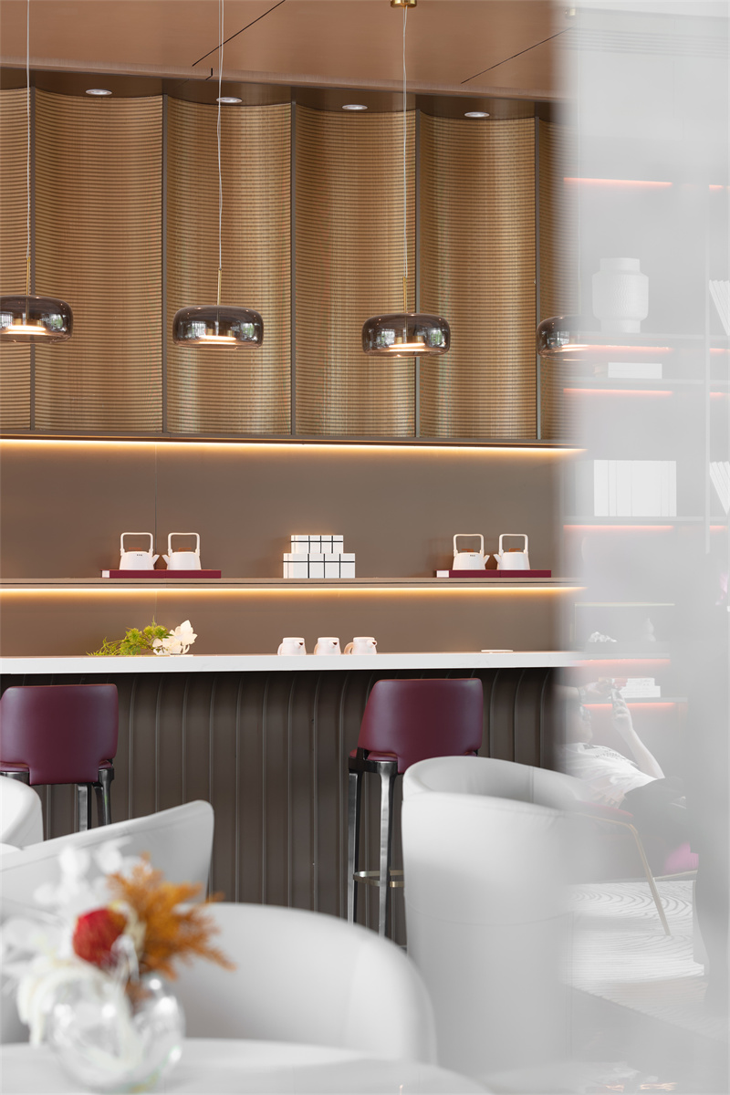 空間運用大面積木色墻面與灰色系瓷磚、局部以沉穩(wěn)的褐色與柔媚的紅色調和,傳遞出現(xiàn)代、優(yōu)雅、奢貴的氣質。水吧金屬波紋背景墻和玻璃吊燈,把水之美展現(xiàn)地淋漓盡致,創(chuàng)造多層次的感官體驗。