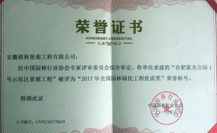 2017年6月18日,由中國園林行業(yè)協(xié)會主辦的2017中國園林綠化發(fā)展高層論壇在大連隆重開幕。會上,我司承接的“藍(lán)光公園1號示范區(qū)景觀工程”被授予“2017年全國園林綠化工程優(yōu)質(zhì)獎”。
