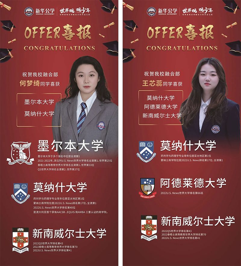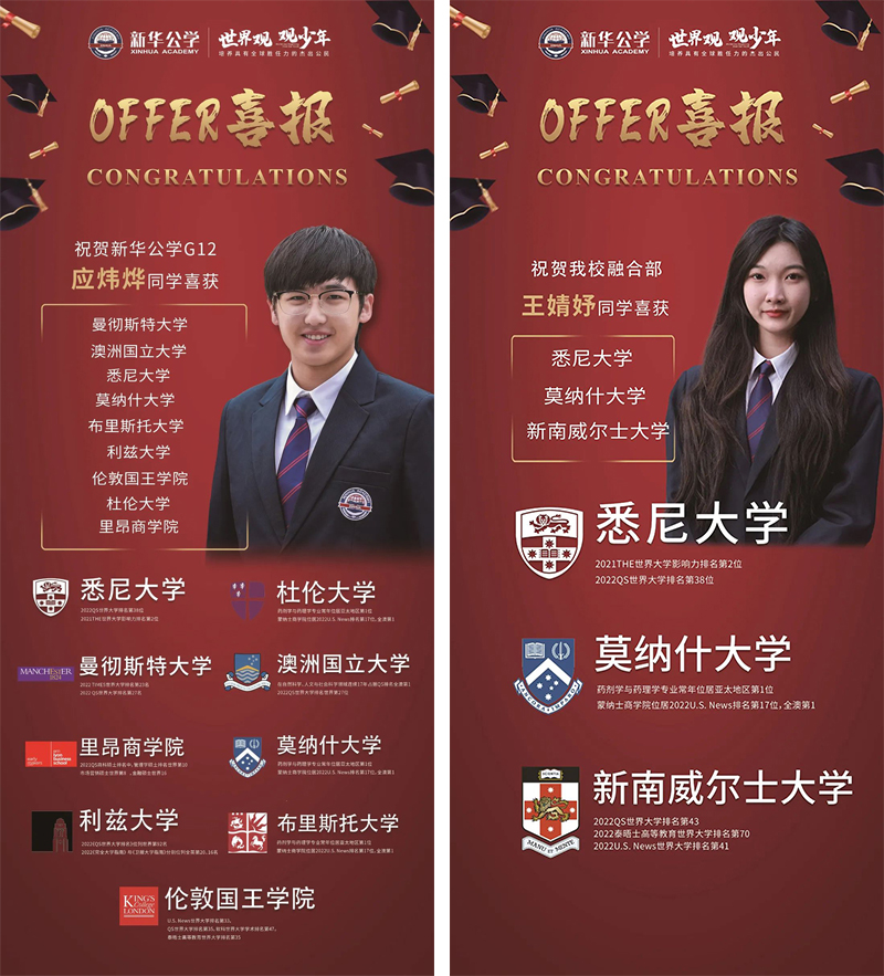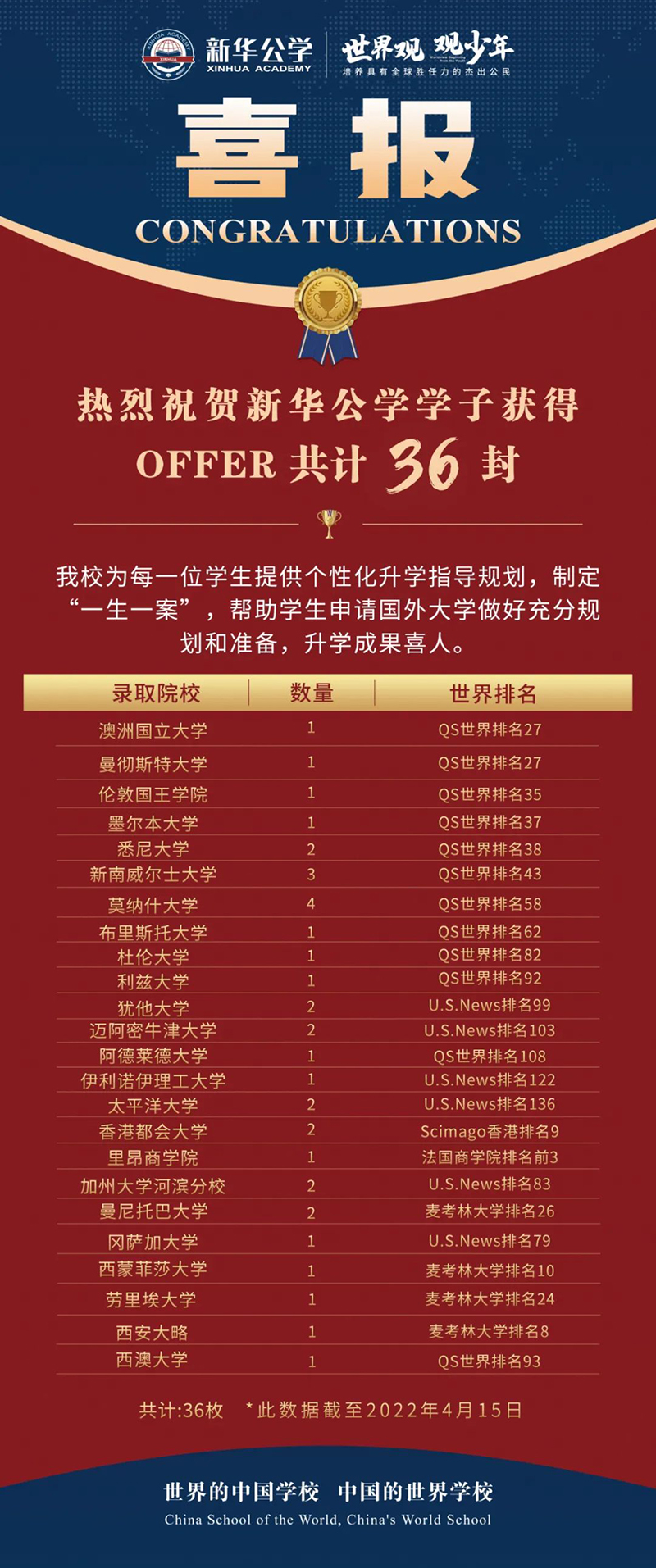 在競爭異常激烈的申請季里,新華學子表現(xiàn)不俗,收獲了豐碩的成果。2021-2022學年新華公學迎來首屆12年級畢業(yè)生,9名學生一共收獲36枚Offer,其中不乏世界TOP10名校。