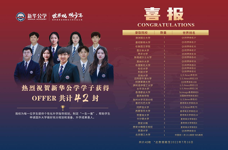 新華學(xué)子捷報頻傳、教學(xué)成果碩果累累。新華公學(xué)首屆12年級畢業(yè)生共收獲42封世界名校offer,其中包含世界Top50海外名校以及國內(nèi)“雙一流”名校。用新華學(xué)子的實際成績,向支持認(rèn)可新華公學(xué)的家長和社會各界交出了一張滿意的答卷。