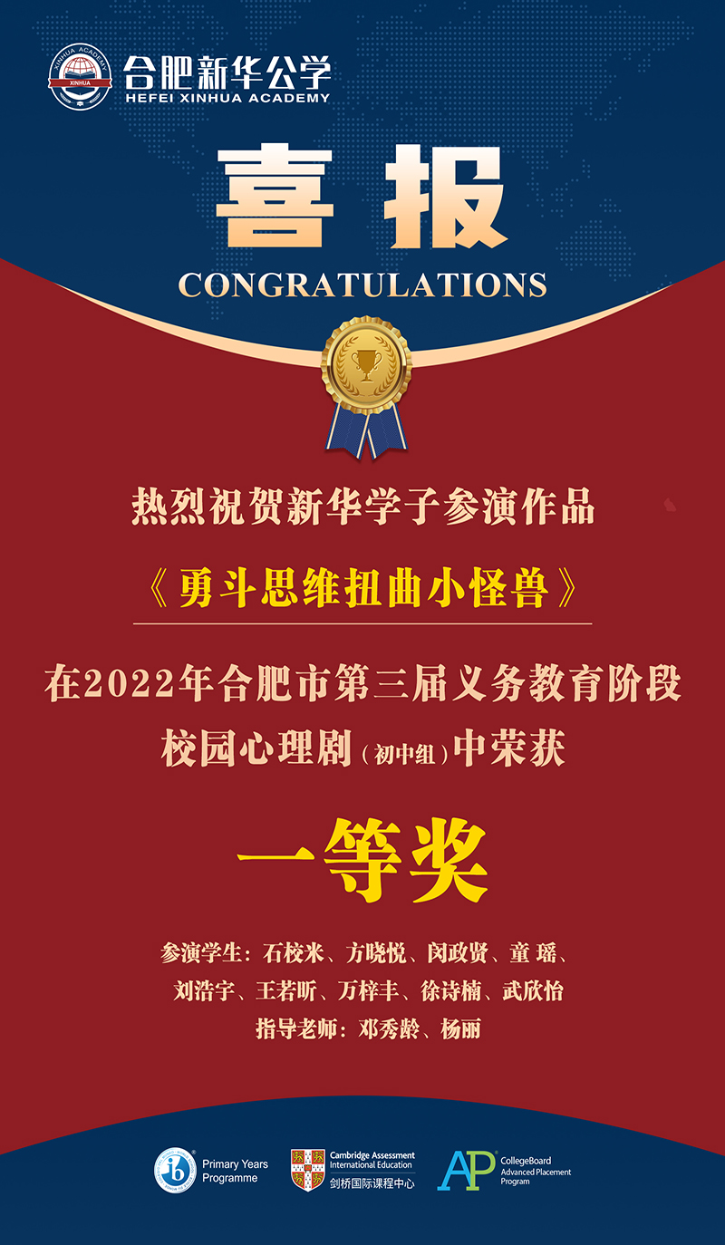 近日,“2022 年合肥市第三屆義務(wù)教育階段校園心理劇”評選活動圓滿結(jié)束,通過激烈的角逐,我校作品《勇斗思維扭曲小怪獸》榮獲初中組合肥市一等獎!