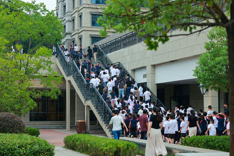 上午9:18,防空警報拉響后,全體學(xué)生在各班班主任的從容指揮下抱頭低姿,迅速撤離到安全地帶,整個過程有條不紊,學(xué)生們?nèi)叹o張肅穆,體現(xiàn)了對此次疏散演練的重視。隨后,各班級迅速清點人數(shù),并向校長進(jìn)行報告。
