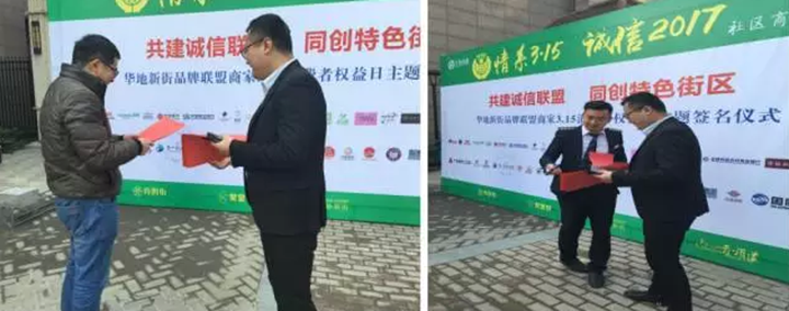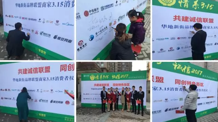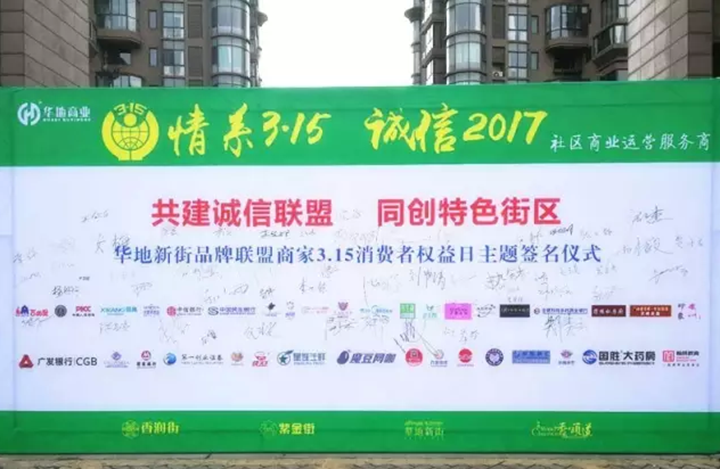 2017年3月15日,“華地新街品牌聯(lián)盟商家3·15消費(fèi)者權(quán)益日”主題簽名儀式在華地新街隆重舉行。上午10時(shí),各商戶代表齊聚在品牌墻下,由商業(yè)公司工作人員向大家宣讀并發(fā)放《倡議書》,各商戶代表在品牌墻上鄭重簽名,為共建誠(chéng)信聯(lián)盟,共創(chuàng)特色街區(qū)而簽下鄭重的承諾。