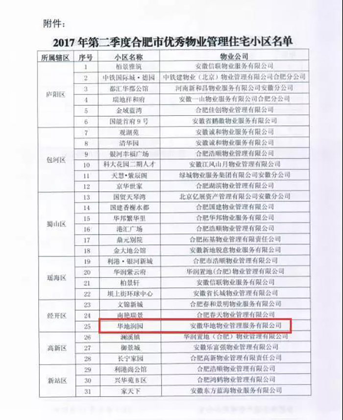近日,合肥市房地產(chǎn)局發(fā)布通報(bào)、公布了“2017年第二季度合肥市優(yōu)秀物業(yè)管理住宅小區(qū)”名單,華地物業(yè)服務(wù)的華地潤(rùn)園名列其中,成為全市31個(gè)獲此殊榮的住宅小區(qū)之一。