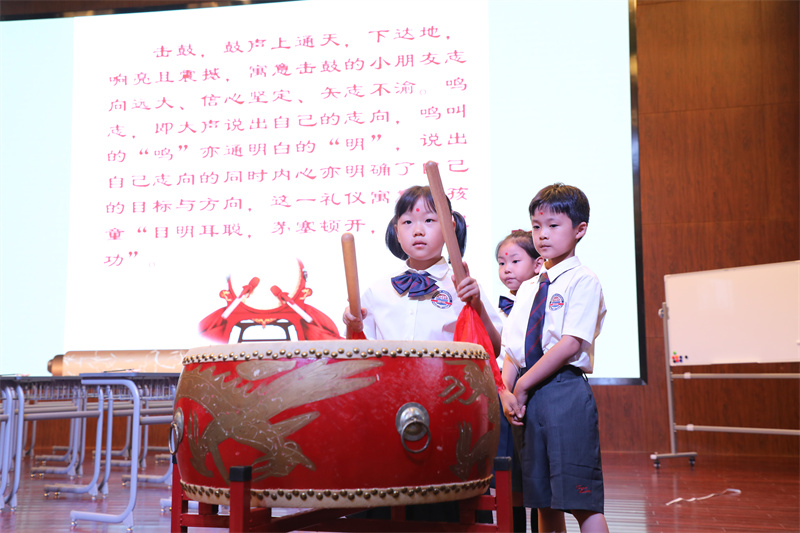 擊鼓三聲,以示從今啟蒙,以立志向。一通鼓:學(xué)子如斯,高山景行;二通鼓:五育并舉,六藝均衡;三通鼓:開(kāi)筆啟智,慧悅?cè)松?/font>