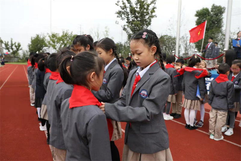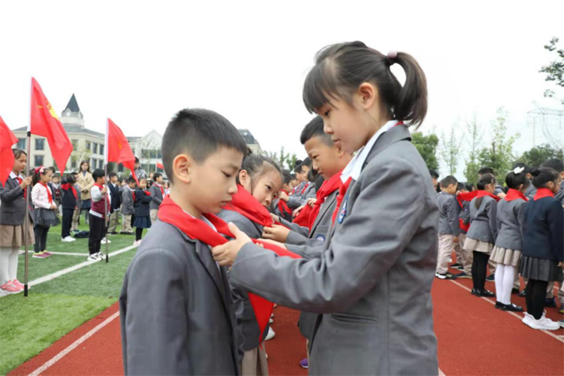 在莊嚴(yán)的隊(duì)旗下,新隊(duì)員們高高舉起右拳大聲宣誓,時(shí)刻準(zhǔn)備著為共產(chǎn)主任事業(yè)貢獻(xiàn)力量!那稚嫩的童聲,回蕩在校園上空,一個(gè)嶄新而又多彩的童年已經(jīng)吹響號(hào)角······
