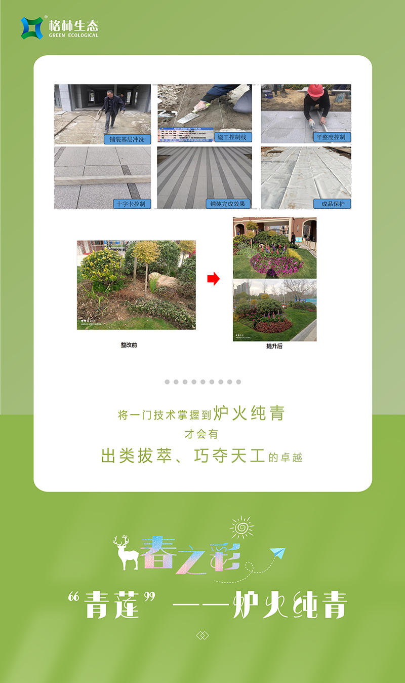 格林生態(tài)在日常培訓(xùn)中格外注重培養(yǎng)參訓(xùn)人員恪守匠德、提升匠藝、開拓匠心,潤物細(xì)無聲般讓“能工巧匠”文化融入每一位員工血脈。我們定期編制、執(zhí)行、檢查反饋和改進(jìn)工藝技術(shù)標(biāo)準(zhǔn),每周進(jìn)行技術(shù)培訓(xùn)、考核,開展技藝大比拼,力求員工技術(shù)達(dá)到爐火純青的地步,但我們不僅要追求高超的工藝和技術(shù),更要對(duì)美好器物、超凡品質(zhì)去主動(dòng)探索,只有這樣才會(huì)讓自己的作品渾然天成、富有靈魂;也只有這樣的作品才會(huì)讓客戶滿意,而客戶臉上的笑容才是我們最終的驕傲。