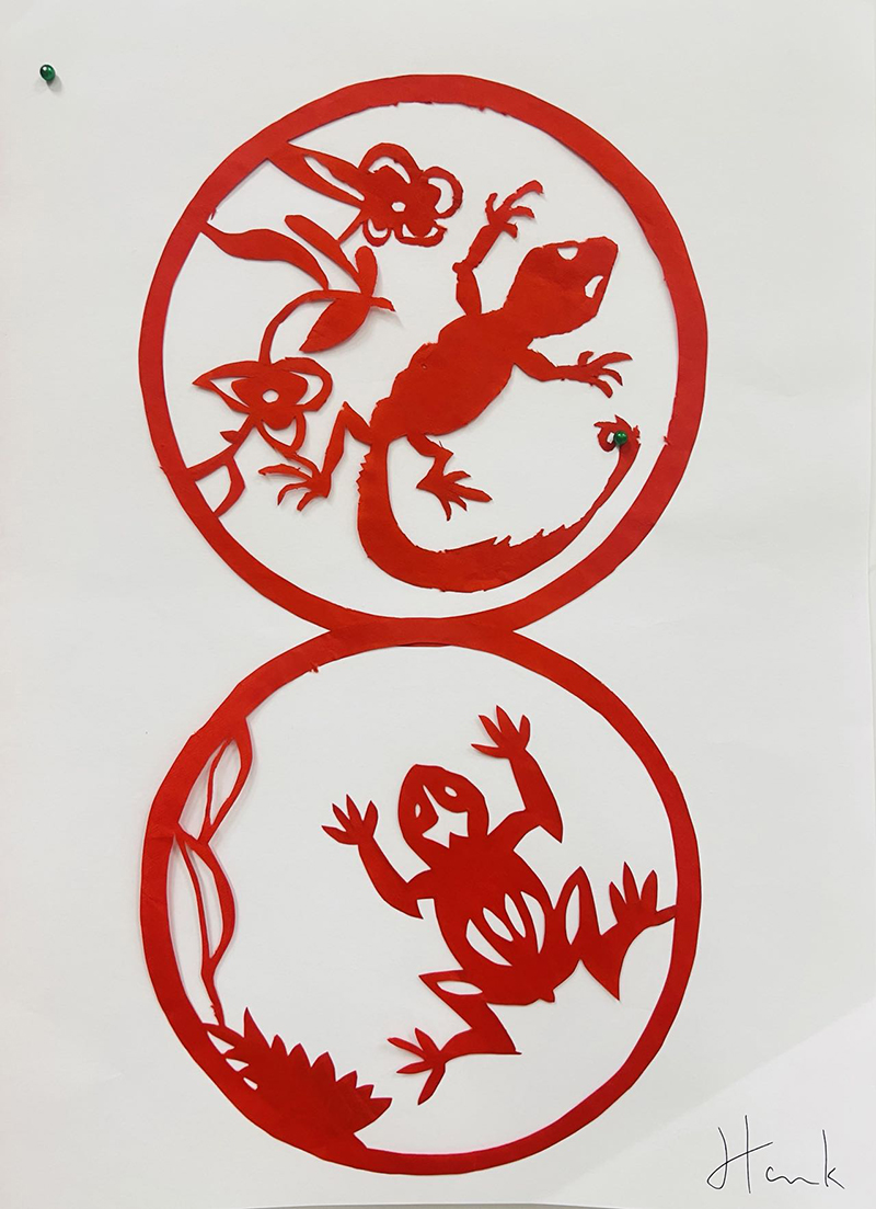 在進(jìn)行剪紙教學(xué)時(shí),教師會(huì)設(shè)計(jì)不同的特定的場(chǎng)景主題,使學(xué)生根據(jù)場(chǎng)景,對(duì)剪紙進(jìn)行設(shè)計(jì)與制作,一來鍛煉學(xué)生的動(dòng)手能力,傳承剪紙藝術(shù);二來鍛煉學(xué)生的思維能力及解決實(shí)際問題的能力;三來學(xué)生根據(jù)相應(yīng)主題剪紙創(chuàng)作,通過不同圖案體現(xiàn)不同寓意,讓視覺語言的運(yùn)用能力得到有效鍛煉。