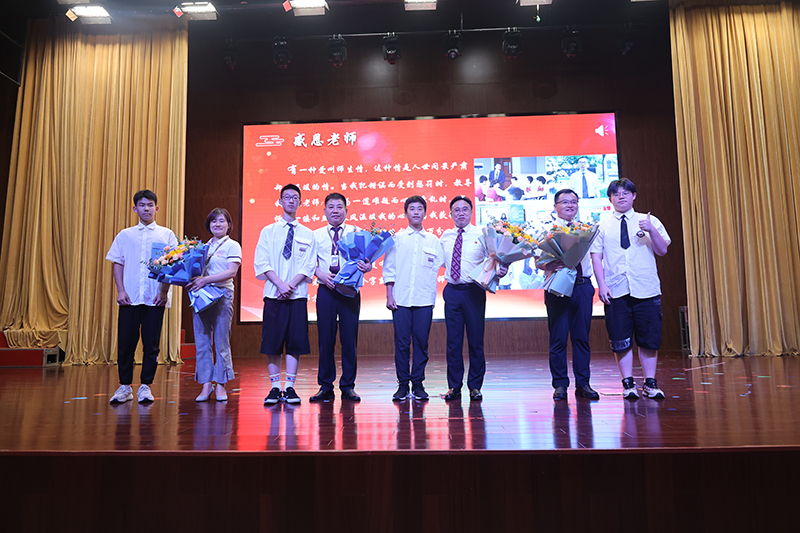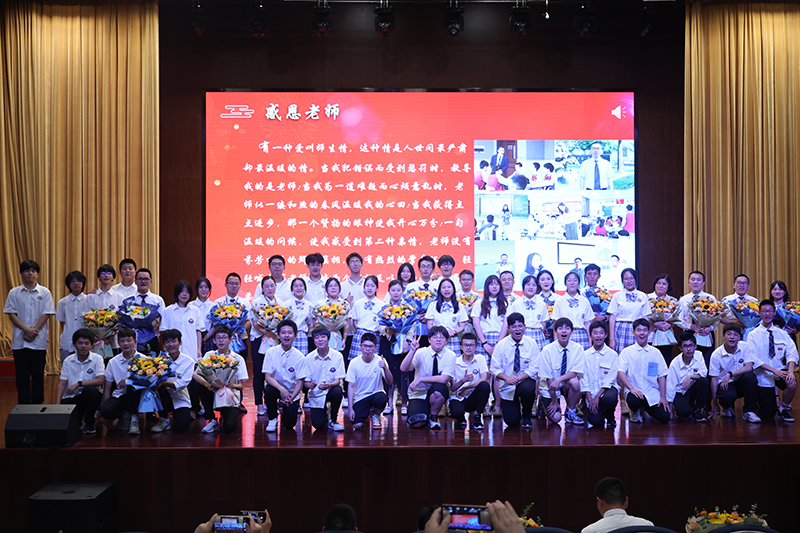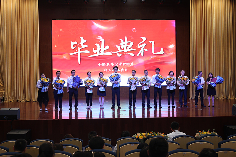 終章散場(chǎng),學(xué)生依次上臺(tái)為敬愛(ài)的老師們送上鮮花,全體初三老師獻(xiàn)唱《放心去飛》?!胺判娜ワw,勇敢地?fù)]別,這一次說(shuō)好了不掉眼淚”,我們緊緊相擁,我們微笑話別,祝福彼此,愿少年此去前程似錦,歸來(lái)功成名遂!