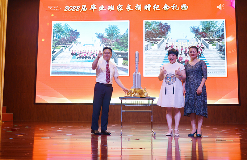 家委會(huì)代表上臺(tái)贈(zèng)送畢業(yè)禮物,有著黃金版心靈的孺子牛就像老師辛勤耕耘,托起上面的火箭(孩子),讓他們飛翔,同時(shí)“火箭”也包含了家長(zhǎng)們對(duì)新華公學(xué)的美好祝愿:越來(lái)越好,牛氣沖天。