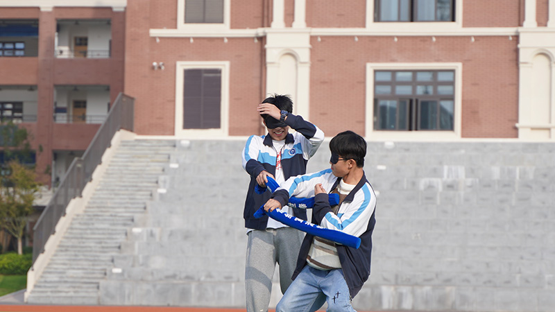 蒙住雙眼,靠聽覺去發(fā)現(xiàn)對方位置,模仿俠客用長條氣球刺敲打?qū)Ψ?,也要注意分辨外界干擾,歡聲笑語在操場飄蕩,幫助同學(xué)們釋放學(xué)習(xí)壓力。