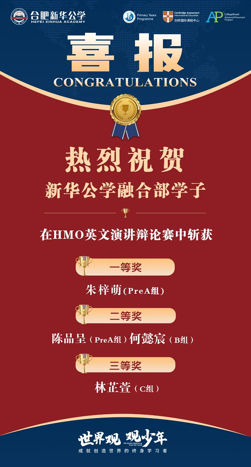 新華公學(xué)始終以打造“高品質(zhì)名?!睘槟繕?biāo),在各個(gè)領(lǐng)域不斷開創(chuàng)新局面,塑造“名師”、打磨“名課”、培養(yǎng)“名生”。在剛剛過去的第三屆"Hear Me Out" 英文公益演講辯論賽中,我校融合部學(xué)子在王佳曦老師的指導(dǎo)下取得優(yōu)異成績,展現(xiàn)了不俗的風(fēng)采!